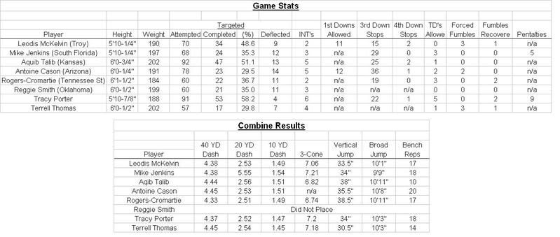 Some of the upper tier CB's had their game stats broken down. One stat that's a little misleading is the 3rd down stops. Those include run stops and pass stops so they are a little high.