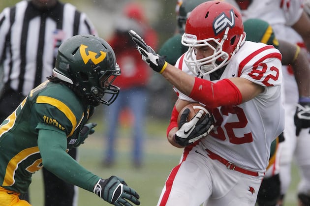 Also played basketball as a Michigan prep. Broke a finger on his left hand as a senior, causing him to switch to running back -- returned to the field with a cast up to his left elbow. Redshirted in 2009. Started 6-of-10 games played in '10 and caught nine balls for 130 yards (13-yard average) and a touchdown. Started 8-of-11 games in '11, tallying 48-968-14 (20.2). Set SVSU single-season records for catches and receiving yards in '12 when he started all 11 games and piled up 106-1635-17 (15.4). Was Great Lakes Intercollegiate Athletic Conference Offensive Back of the Year in '13 when he totaled 83-1,572-14 (18.9) in 12 contests.