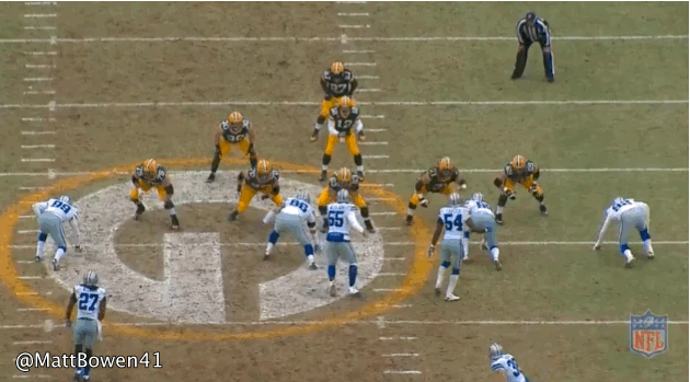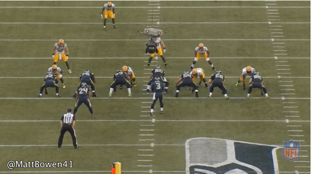 I believe this is the pay that wist likes to claim proves Capers is unsound. Its a triple option, Matthews at OLB has Lynch, Shields has wide contain and therefore Wilson and HHCD has Lockette. HHCD blows the tackle despite getting into good if not great position. Packers are in the 4-3 Quad look I believe.