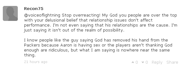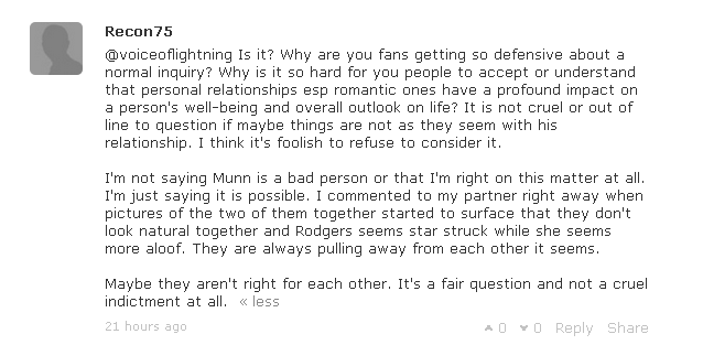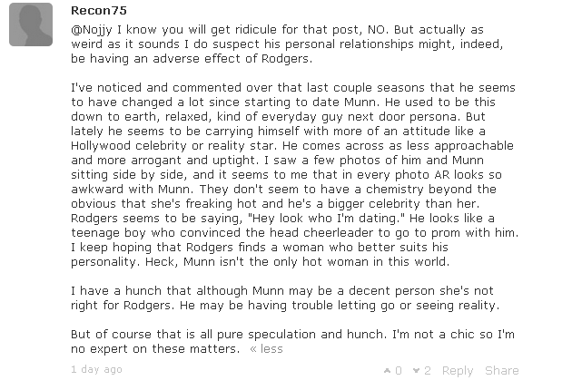 I can sympathize with Rodgers and Munn, but that type of reporting sort of comes with the job of being an NFL starting QB and dating an entertainment celebrity. Heck, it has been done since Joe Namathy was playing for the Jets and being seen with every female celebrity on the planet, it seemed.