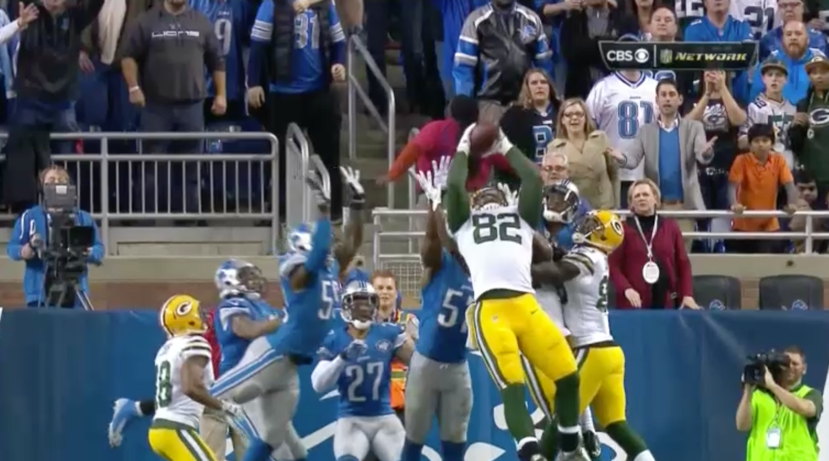 I said right away that the guy on the right (didn't catch that it was Jones right away) cleared out the interference so Rodgers could come down with it almost uncontested.
