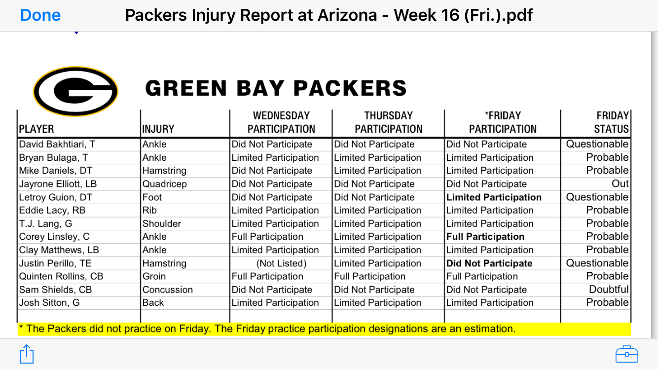 Packers T David Bakhtiari (ankle) has been downgraded to DOUBTFUL. TE Justin Perillo (hamstring) and CB Sam Shields (concussion) have been ruled OUT for tomorrow’s game against the Cardinals.