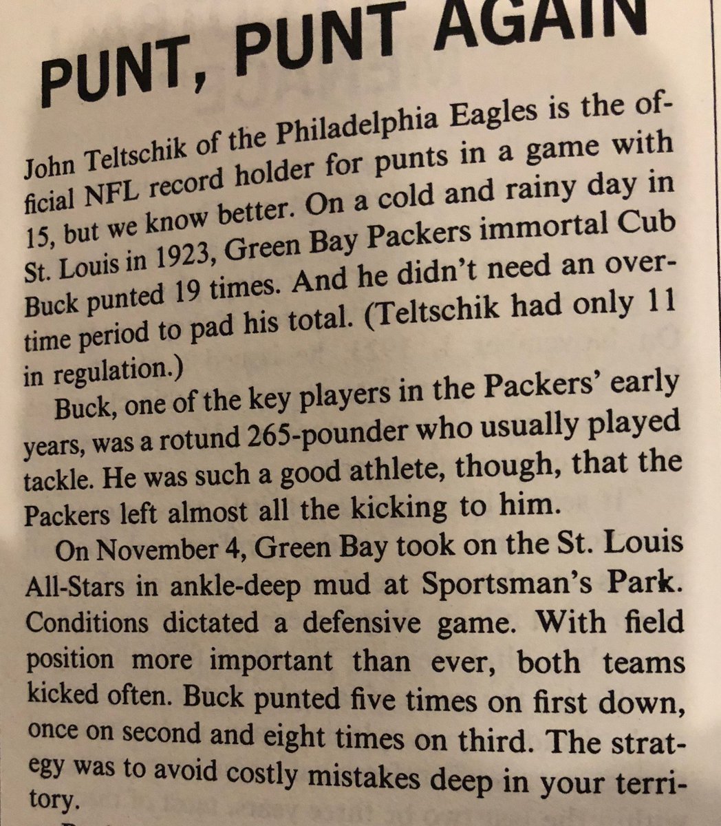In 1920s football, moving the ball was so difficult that field position was vital. In one game, the Packers punted five times on first down! (From The Pro Football Chronicle, 1990, by Daly and O'Donnell.)