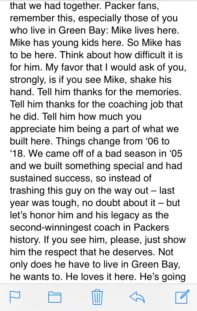 Rodgers said he thinks "we need to honor Mike. "We did some incredible things. Instead of trashing him on the way out, remember the great things we did. If you see Mike, shake his hand and tell him how much you appreciate what we accomplished."