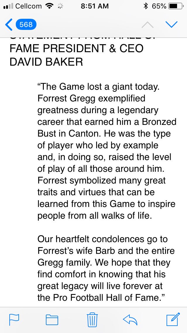 Sad to hear. You think of what an offensive linemen should be, you think of those great Packer teams led by Gregg and Kramer. I loved watching them run the sweep. Just quality football in a time when it wasn't necessarily about strategy and chess pieces, but about kicking the shit out of the eleven guys across from you. Running plays regardless if the defense knew what was coming because it wasn't about which coach was smarter, it was about which coach got the most from his players.