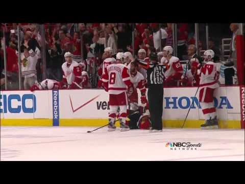 detroit player drills a blackhawks player and launches him into one of the benches, the pulls the guy out and down onto the ice.